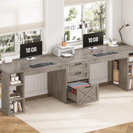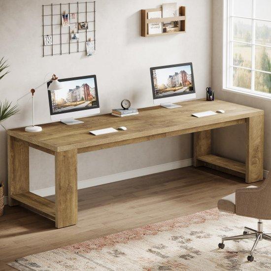 Yaklaşık 2 metre uzunluğunda olan masa, geniş bir çalışma alanı sağlıyor. İki ayrı çalışma istasyonu içeren tasarımı, birlikte çalışan kişilere veya ev ofisinde eş zamanlı iş yapanlara rahat bir ortam yaratıyor.