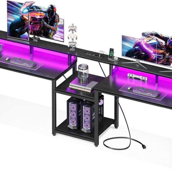 Masanın en dikkat çeken özellikleri arasında iki ayrı monitör için geniş platform, ortada yerleştirilmiş bilgisayar ünitesi ve USB şarj bağlantı noktası bulunmaktadır. Mor LED aydınlatma, masaya dinamik ve modern bir görünüm katarak çalışma alanınızı daha çekici hale getirir.