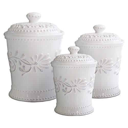 Beyaz renkte ve zarif bir tasarıma sahip bu 3 parçalı seramik kavanoz seti, mutfak dekorasyonunuz için şık bir çözüm sunuyor. Tamamen seramikten üretilen kavanozlar, farklı boyutlarda (yaklaşık 0,6 lt, 1,4 lt ve 2,4 lt) ve birbirine benzer detaylı desenlerle tasarlanmış.