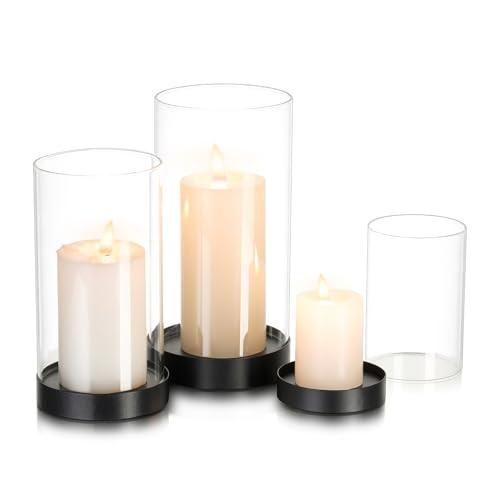 Bu dekoratif şamdan seti, modern iç mekan tasarımları için ideal bir aksesuar niteliğindedir. Şeffaf cam silindirlerin içinde duran krem rengi mumlar, siyah metal altlıklar üzerinde zarif bir görünüm sergiliyor. Üç farklı boyutta tasarlanan set, esnek bir dekorasyon imkanı sunuyor.