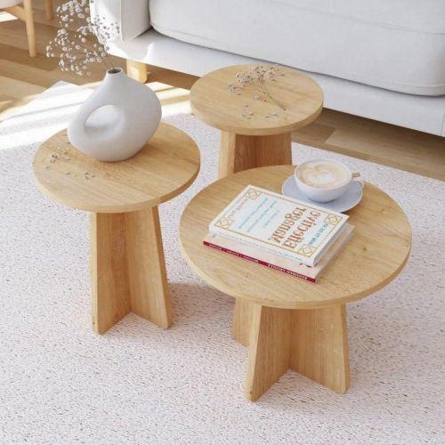Modern ve minimalist bir tasarıma sahip bu üçlü sehpa seti, Skandinavya tarzı dekorasyonun çarpıcı bir örneğini sunuyor. Açık ahşap tonlarında üretilen sehpalar, yumuşak yuvarlak hatlara ve sade bir çizgiye sahip. Her bir sehpa farklı yükseklikte tasarlanmış, bu da onlara dinamik ve estetik bir görünüm katıyor.