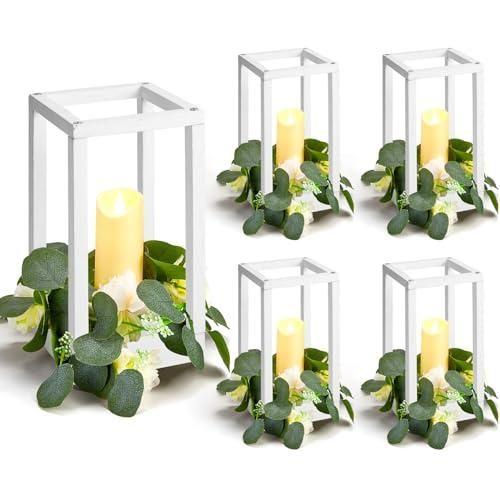 Modern ve şık tasarımıyla öne çıkan bu dekoratif ürün, beyaz metal çerçeveli mumluk ve çevre süslemelerinden oluşan bir settir. Toplam 5 adet mumlu fener içerir. Her bir fener, beyaz metal çerçeve içinde sarı renkli mum ve yeşil yapraklı eukaliptus dallarıyla dekore edilmiştir.