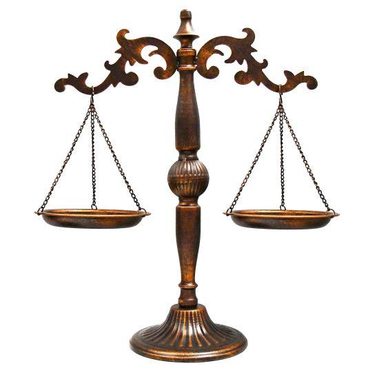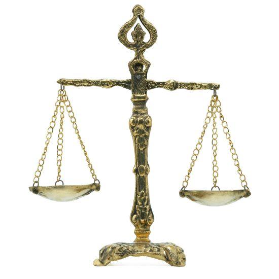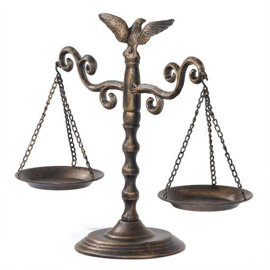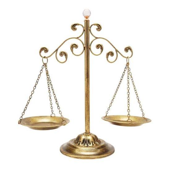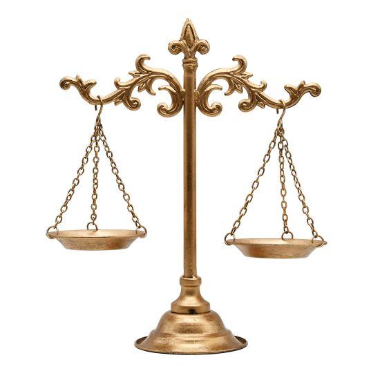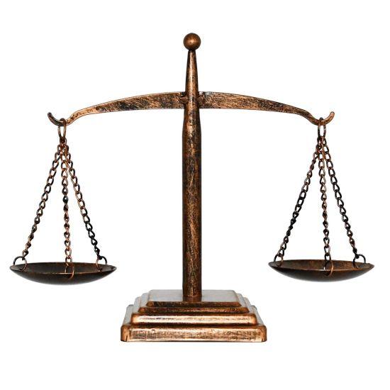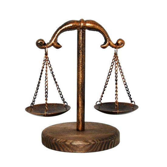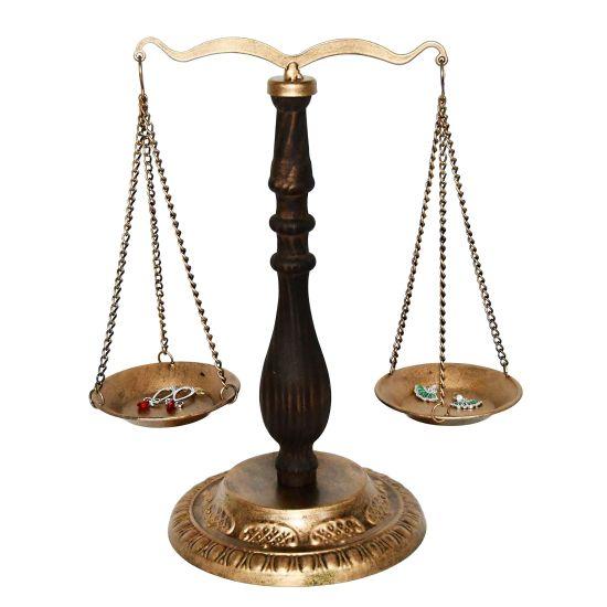 İki yanında asılı duran bronz kefeler, hassas bir denge içinde. Bu kefeler, adaletin iki tarafını temsil ediyor ve kararların dikkatle tartılması gerektiğini hatırlatıyor. İnce zincirler, kefeleri ana gövdeye bağlıyor ve terazi mekanizmasının hassasiyetini gösteriyor.