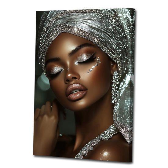 3. Afrikalı Kraliçe: Gözleri kapalı, başı dik duran bir kadın portresi. Mor tonlarındaki makyajı ve takıları ile kraliyet havasını yansıtıyor. Güçlü duruşu ve özgüveni ile dikkat çekiyor.