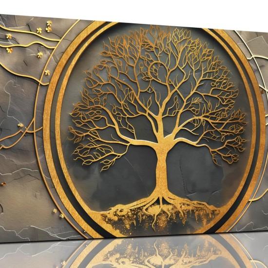 Tablonun ana unsuru, ince dalları ve güçlü kökleriyle sembolik bir yaşam ağacı figürüdür. Altın sarısı tonlarında işlenmiş ağaç, dairesel bir çerçeve içinde yerleştirilmiş. Arka plan gri tonlarında, yumuşak dalgalı bir doku sergiliyor. Tablo üzerinde küçük altın noktalar ve dallar dekoratif bir etki yaratıyor.