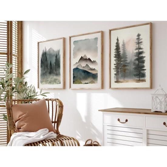 Doğanın sakinliğini ve huzurunu evinize taşıyan bu üç parça duvar tablosu, modern ve minimalist bir dekoratif aksesuar olarak karşınıza çıkıyor. Her bir tablo, yumuşak ve geçişli suluboya teknikleriyle çizilmiş farklı orman manzaralarını içeriyor.