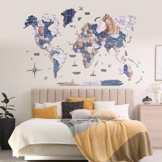 Haritanın üzerinde yer alan okyanus isimleri, ahşap uçaklar, tekneler ve pusula gibi dekoratif öğeler, tasarıma ilgi çekici detaylar ekler. Bu öğeler, dünya seyahatinin heyecanını ve macerasını yansıtır.