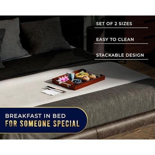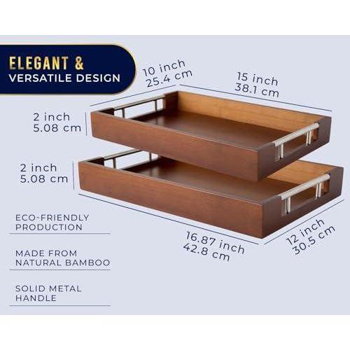 Bu ahşap kulplu tepsi seti, mutfağınıza ve ev dekorasyonunuza şık bir dokunuş getirecek pratik bir aksesuar. Doğal bambu malzemeden üretilen tepsi seti, iki farklı boyutta tasarlanmış olup iç içe geçme özelliğine sahiptir.