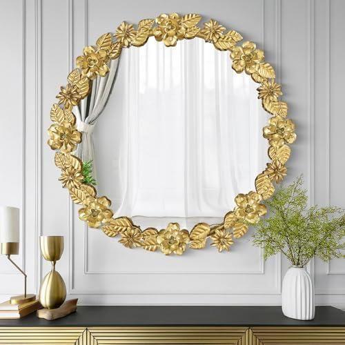 Altın Çiçek Desenli Yuvarlak Dekoratif Ayna