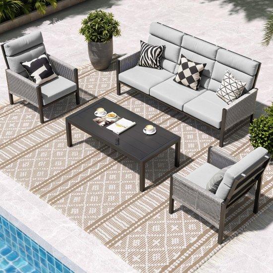 Set, geniş bir üç kişilik kanepe, iki ayrı koltuk ve şık bir orta sehpadan oluşuyor. Mobilyaların alüminyum iskeletleri dayanıklı ve hafif, ahşap kolçakları ise sıcak bir dokunuş katıyor. Gri renk tonları, bahçe ve teras dekorasyonlarına kolayca uyum sağlıyor.