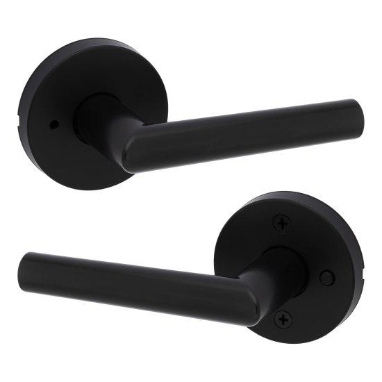 Ürün, yuvarlak rozet ve düz çizgili kol tasarımıyla dikkat çekiyor. Mat siyah yüzeyi pürüzsüz ve homojen bir görünüm sergiliyor. Hem estetik hem de işlevsel olan bu kapı kolu, iç mekanlarda banyo ve yatak odası gibi alanlarda kullanıma uygundur.