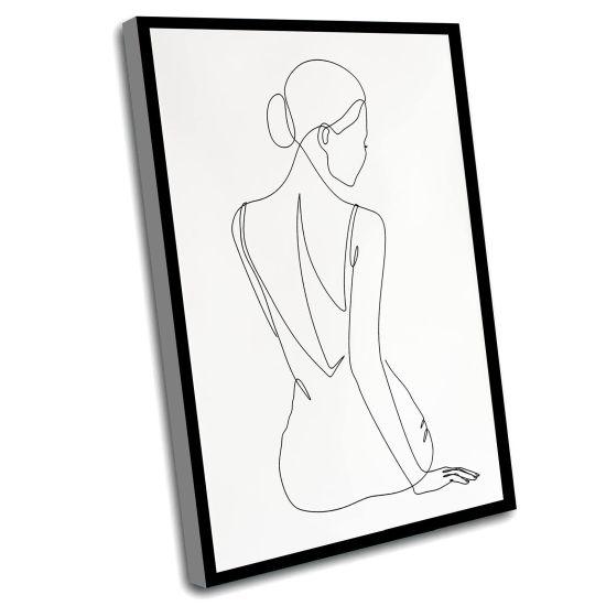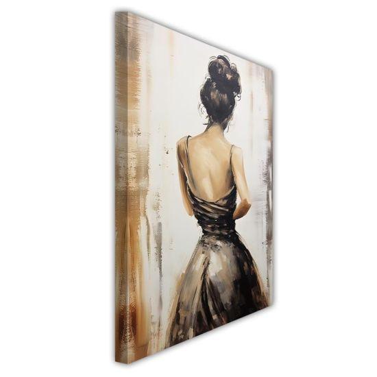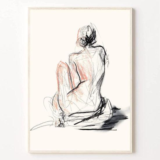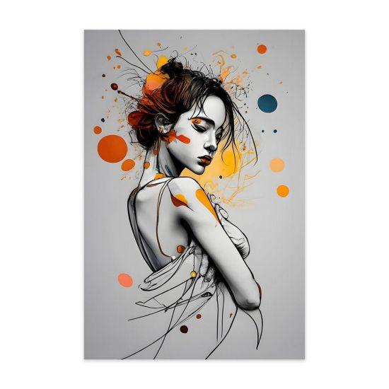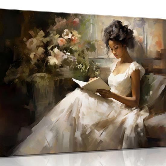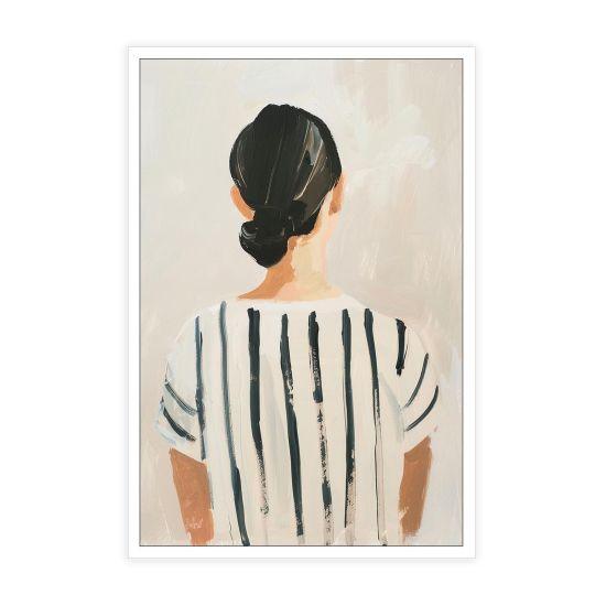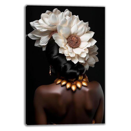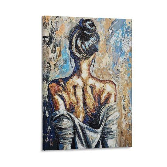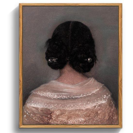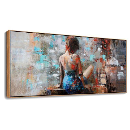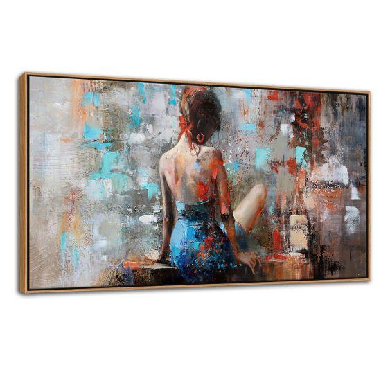 Tablonun merkezinde, arkası dönük bir kadın figürü yer alıyor. Kadının saçları özenle toplanmış ve omuzlarında çiçek dövmeleri görülüyor. Etrafında renkli yusufçuklar uçuşuyor, bu da tabloya fantastik ve rüya gibi bir hava katıyor.