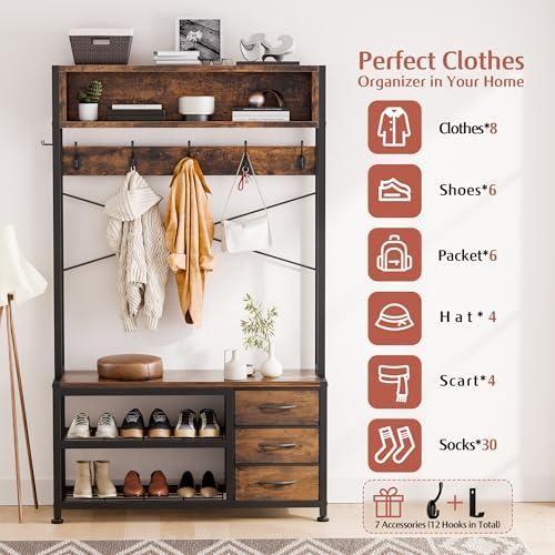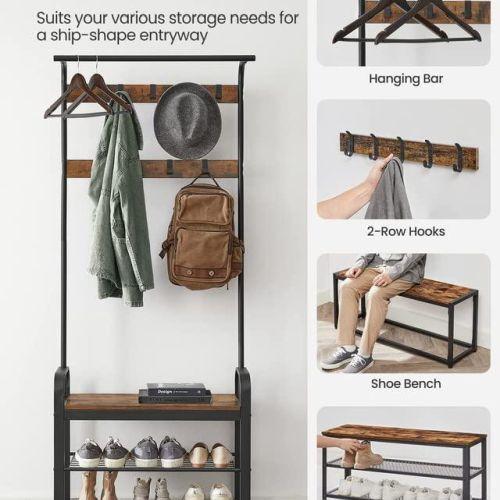 Üst askı direğinde giysilerinizi asabilir, yan kancalara çantalarınızı ve şapkalarınızı koyabilirsiniz. Alt raflarda ayakkabılarınızı veya kutuları düzenleyebilirsiniz.