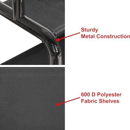 Dayanıklı 600D kumaş rafları, ayakkabılar, kutular veya günlük eşyalar için ekstra depolama alanı sağlar. Siyah mat kaplaması, modern ve şık bir görünüm sunarken aynı zamanda çizilmeye karşı dayanıklı bir yüzey oluşturur.