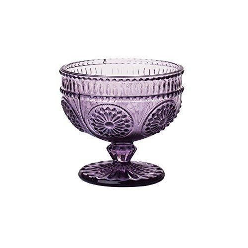 Bu zarif cam şekerlik, antik çağlardan esinlenen vintage bir tasarıma sahiptir. Mor rengi ile hem modern hem de klasik dekorasyon tarzlarına uyum sağlar. Kabartmalı çiçek desenleri ve yuvarlak ayağı, ürüne benzersiz bir estetik kazandırır.