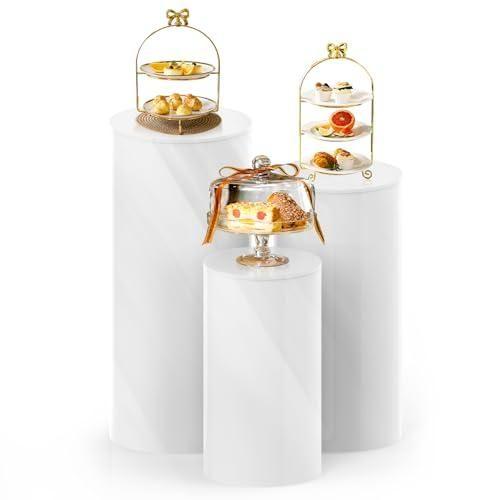Bu dekoratif ürün, üç farklı boyutta silindirik beyaz ayaklı kaidelerden oluşan bir sunumluk seti. Her bir kaide, üzerinde altın rengi çerçeveli cam kapaklı standlar barındırıyor. Beyaz PVC malzemeden üretilen kaideler, oldukça sağlam ve dayanıklı.