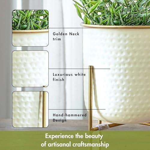 El işçiliği ile üretilen saksılar, yüksek kaliteli metalden imal edilmiştir. Üzerlerinde özel bir çekiç desenli doku bulunmakta, bu da ürüne benzersiz bir görünüm katmaktadır. Dış yüzeyi mat ve pürüzsüz bir dokuda olan saksıların kenarları parlak altın rengi ile çevrelenmiş.