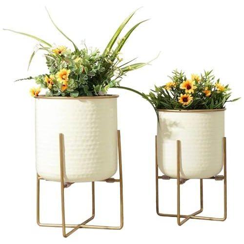 Bu dekoratif ürün, modern ev dekorasyonunun vazgeçilmez parçalarından biri olacak şekilde tasarlanmıştır. İki farklı boyutta gelen bu çiçeklik seti, off-white rengi ve altın detaylarıyla dikkat çekiyor.