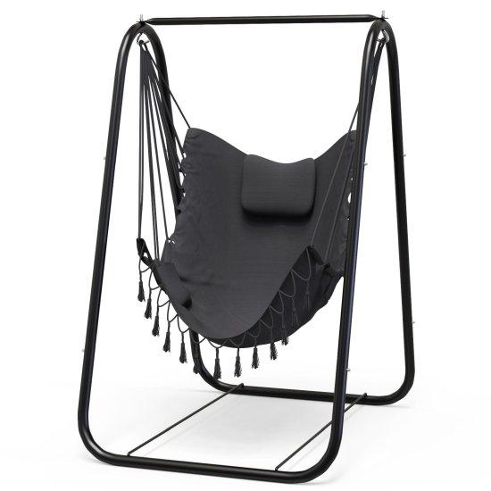 Bu ayaklı salıncak, modern ve şık tasarımıyla yaşam alanlarınıza rahat bir dinlenme köşesi katacak özel bir aksesuar. Koyu gri/antrasit renkte üretilen ürün, yumuşak dolgulu minderi ve estetik görünümüyle dikkat çekiyor.