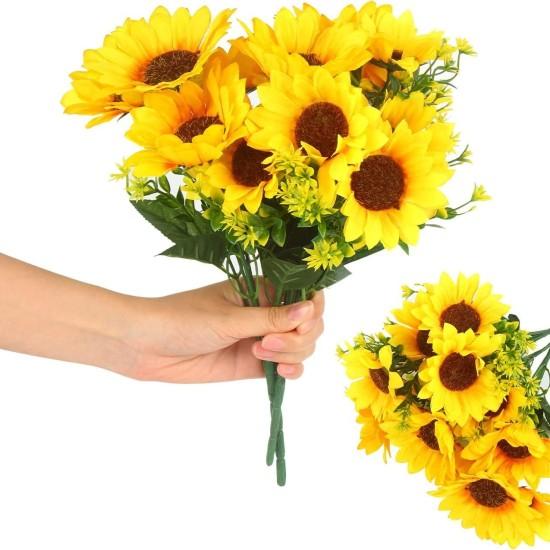İki ayrı demet halinde tasarlanan buket, toplam 6-7 adet yapay ayçiçeği içerir. Her bir çiçek, yumuşak dokulu ipek kumaştan üretilmiştir. İnce yeşil sapları ve çevrelerindeki küçük yapraklarıyla son derece gerçekçi bir görünüm sergiler.