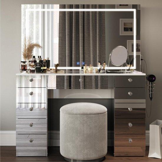 Bu aynalı çalışma masası, şık ve fonksiyonel tasarımıyla yatak odaları ve makyaj alanları için ideal bir aksesuar. Gri renkte zarif bir görünüme sahip olan ürün, toplam 11 çekmecesiyle oldukça geniş depolama alanı sağlıyor.