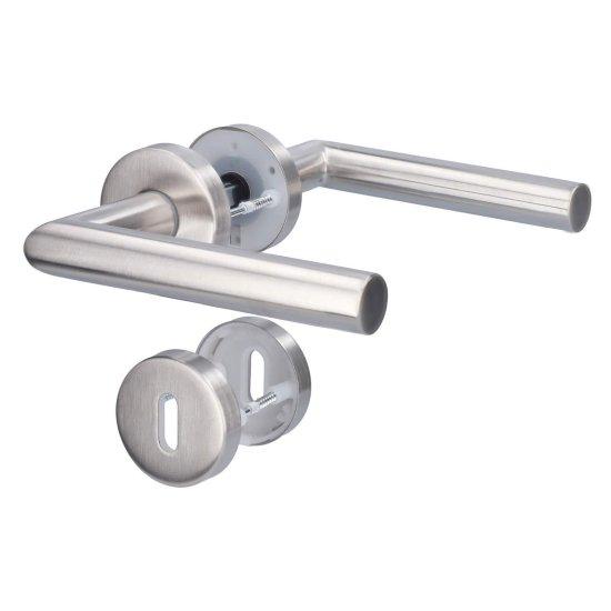 Ürün, L şeklinde tasarlanmış ergonomik bir kol ve yuvarlak bir rozetten oluşmaktadır. Paslanmaz çelik malzemesi sayesinde oldukça dayanıklıdır ve uzun yıllar kullanılabilir. Cilalı yüzeyi hem estetik hem de hijyenik bir görünüm sağlar.