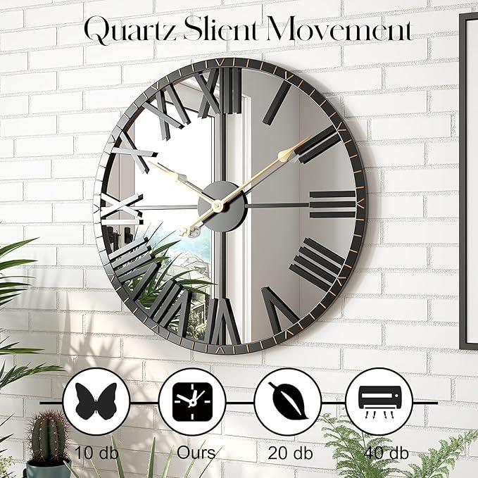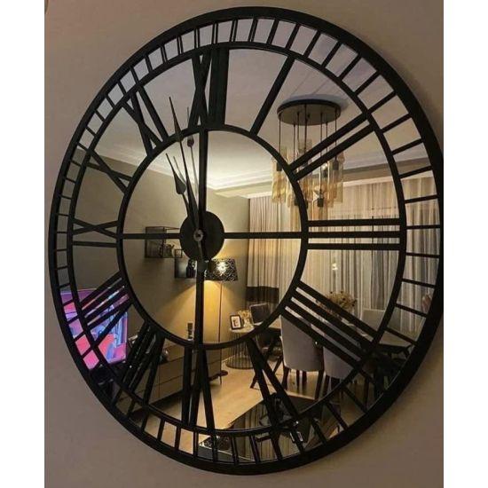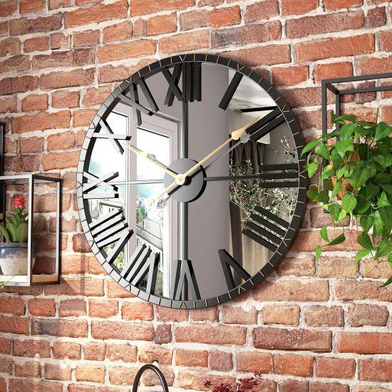 Saat, yarı saydam ayna yüzeyi ve gümüş tonlu metal çerçevesiyle minimal ve çağdaş bir stil sergiler. Klasik Roma rakamları ile süslenmiş kadran, endüstriyel ve modern tasarım anlayışını mükemmel şekilde yansıtır. Siyah çizgiler ve altın rengi akrep-yelkovan, saatin estetik detaylarını güçlendirir.