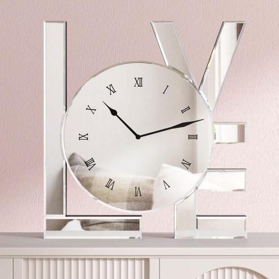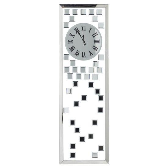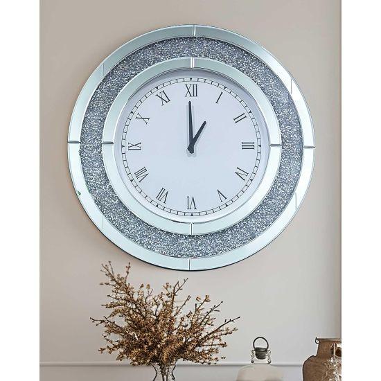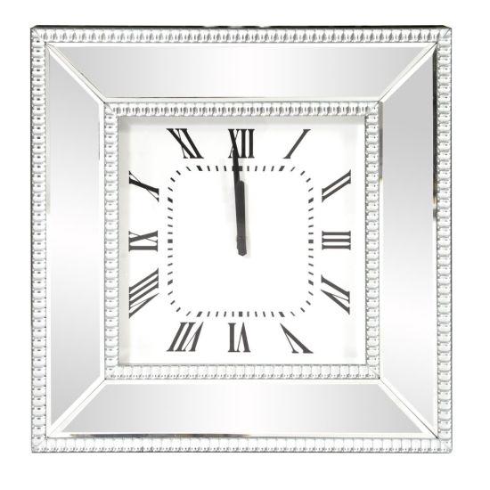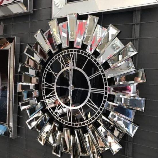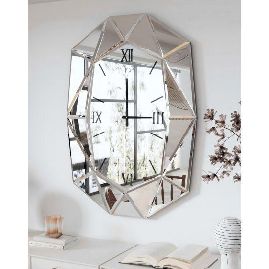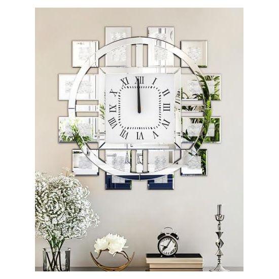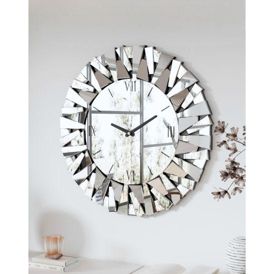 Ürünün yüzey dokusunda parlak ve şeffaf ayna yüzey hakimdir. Saat kadranı beyaz zemin üzerine siyah Roma rakamlarıyla tasarlanmış, çevresinde ışık yansımalarını artıran geometrik ayna parçaları bulunmaktadır. Bu tasarım, mekâna derinlik ve genişlik hissi katar.