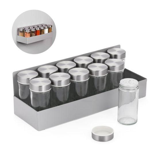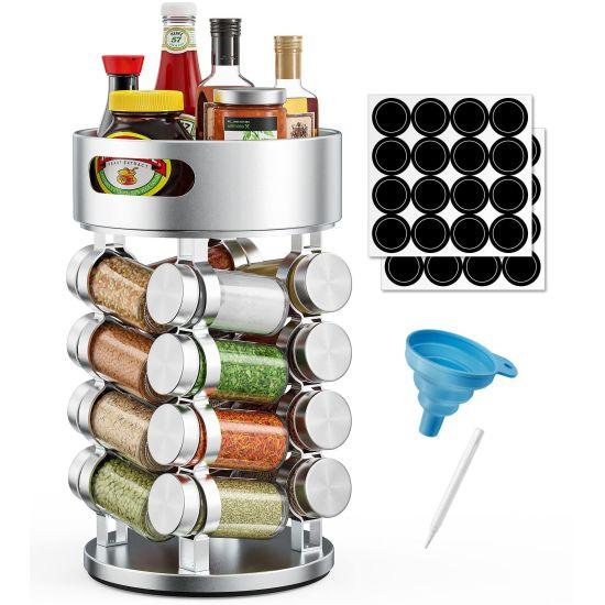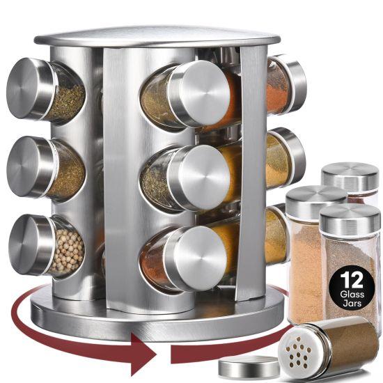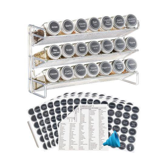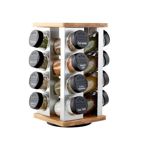 Paslanmaz çelik malzeme, uzun ömürlü ve korozyona dayanıklı bir yapı sunuyor. Cam kavanozlar sayesinde baharatların içeriği net bir şekilde görülebiliyor. Her kavanozun üzerinde baharatın ismi yazılı, böylece hızlıca aradığınız baharatı bulabiliyorsunuz.