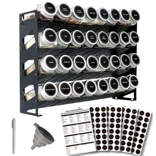 Her bir cam kavanoz farklı bir baharat için etiketlenmiş durumda. Curry, thyme, sea salt, rosemary gibi çeşitli baharatlar için ayrı ayrı bölümler bulunuyor. Kavanozların şeffaf yapısı içindeki baharatların net bir şekilde görülmesine olanak sağlıyor.