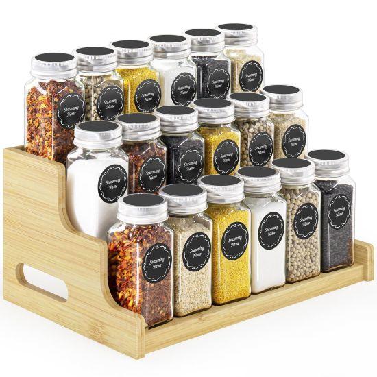 Her bir baharat şişesi yeşil kapaklı ve şeffaf cam malzemeden üretilmiş. Şişelerin üzerinde organik oldukları net bir şekilde belirtilmiş, bu da sağlıklı beslenme konusunda hassas tüketiciler için ideal bir tercih olduğunu gösteriyor. Üç farklı katta düzenlenmiş şişeler, mutfağınıza hem işlevsellik hem de görsel zenginlik katıyor.