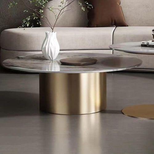 Çağdaş iç mekan tasarımları için özel olarak üretilen bu dekoratif sehpa, zarafet ve işlevselliği mükemmel bir şekilde birleştiriyor. Yuvarlak formlu sehpanın üst yüzeyi gri mermer dokusuna sahip olup, altın renginde silindir şeklindeki ayak kısmı ile harika bir kontrast oluşturuyor.