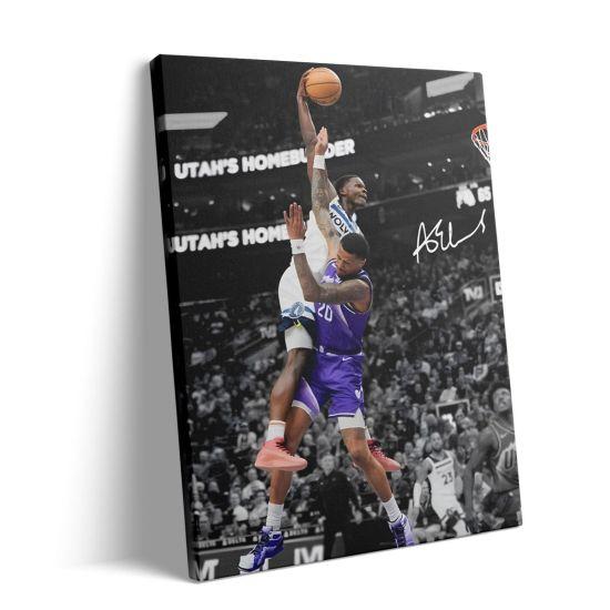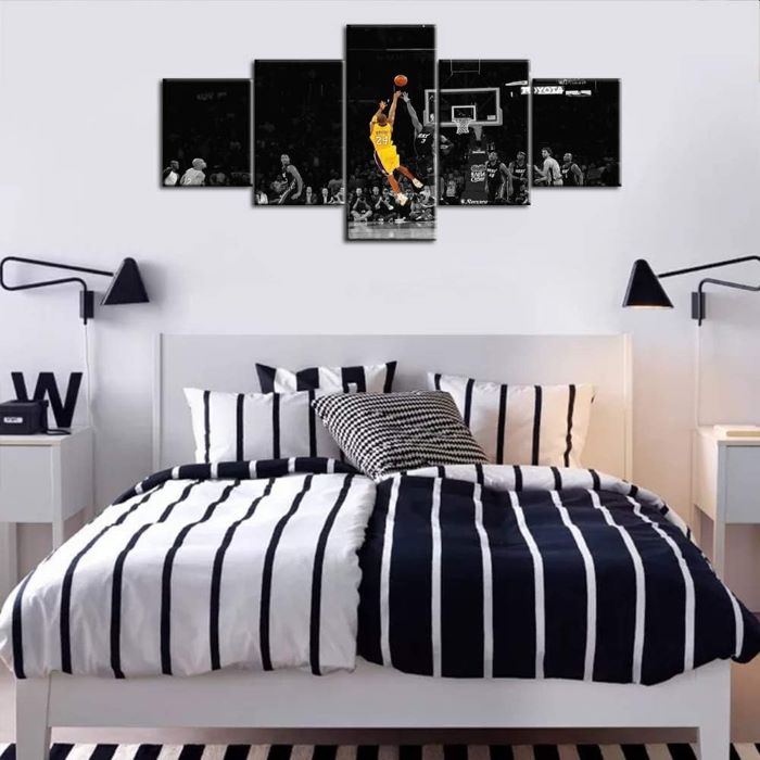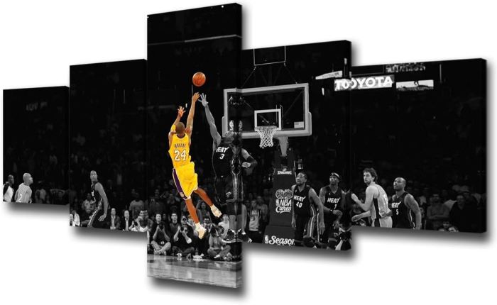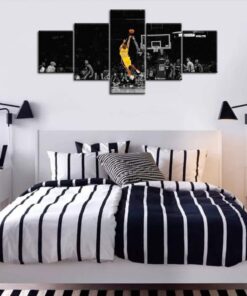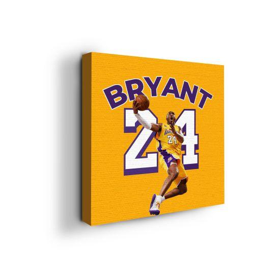 Tabloda, sarı formasıyla ünlü 24 numaralı oyuncunun havada süzülerek atış yaparken ki anı resmedilmiş. Siyah-beyaz arka planda parıldayan sarı forma ve turuncu top, görsel bir şölen sunuyor. Oyuncunun zarif ve güçlü duruşu, basketbolun dinamizmini mükemmel şekilde yansıtıyor.