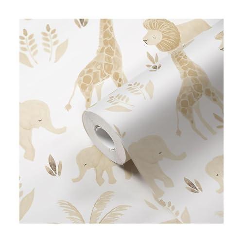 Bu duvar kağıdı, bebek odaları için özel olarak tasarlanmış zarif ve şık bir dekoratif üründür. Açık bej ve krem tonlarında, yumuşak bir renk paleti kullanılarak hazırlanmış. Beyaz zemin üzerinde sevimli safari hayvanları – fil, zürafa ve diğer detaylar hassas bir şekilde resmedilmiş.