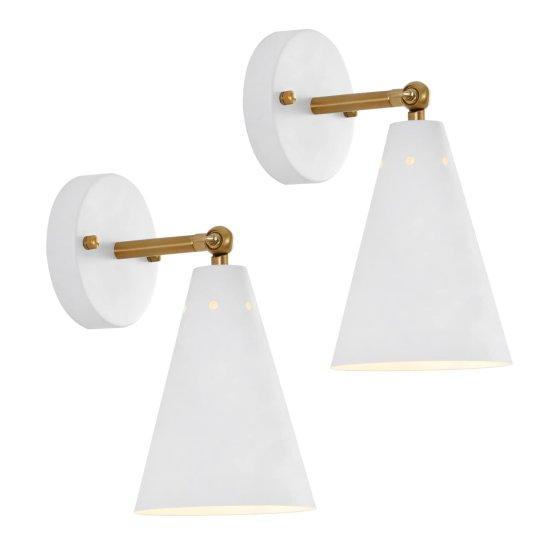 Bu zarif duvar aplikleri, modern iç mekan dekorasyonunun vazgeçilmez parçalarıdır. Beyaz renk ve altın/pirinç tonundaki ayar kolu, minimalist bir tasarımı yansıtır. Piramidal formda tasarlanan metal abajur, yumuşak ve yönlendirilebilir bir ışık sağlar.