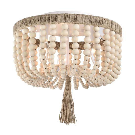Ürün tamamen ahşaptan üretilmiştir. Beyaz renkli ahşap boncuklar, doğal keten veya jüt ipli bir askı sistemiyle bir araya getirilmiş. Üç farklı aydınlatma noktası bulunan avize, ince ve zarif detaylarıyla dikkat çekiyor.