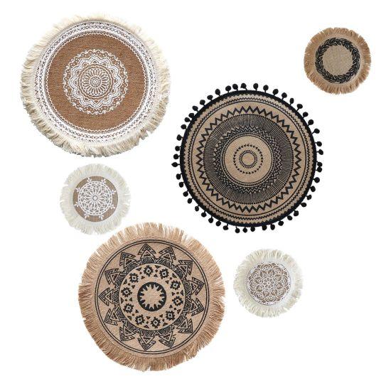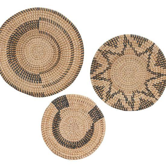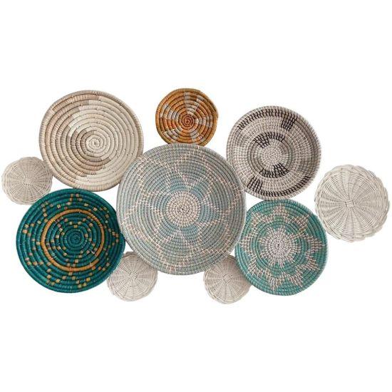 Bu bohem duvar tabağı seti, evinize etnik ve doğal bir dokunuş katıyor. Set, farklı boyut ve desenlerde el örgüsü tabakların harmonik bir kompozisyonunu sunuyor.