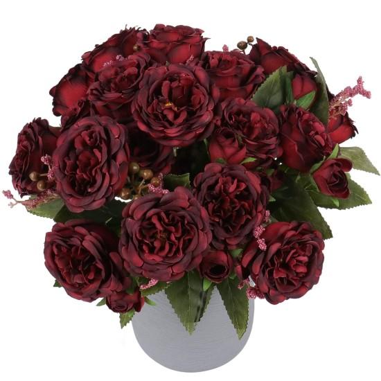 Bu yapay çiçek aranjmanı, zengin bordo tonlarıyla göz alıcı bir görünüm sergiliyor. Yumuşak ve kadife dokulu şakayık çiçekleri, zarif bir biçimde düzenlenmiş. Her bir çiçek katman katman açılmış güller şeklinde, gerçekçi yapraklarla çevrelenmiş.