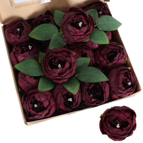 Çiçekler, ipek kumaştan üretilmiş olup gerçek şakayıklara son derece benzer bir görünüm sergiliyor. Yumuşak dokulu bordo renk tonları, çiçeklere zengin ve sofistike bir görünüm kazandırıyor. Her bir çiçeğin merkezinde küçük detay noktaları bulunuyor ve çevrelerinde koyu yeşil yapraklar yer alıyor.