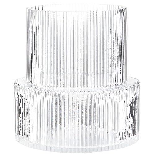 Yaklaşık 19 cm yüksekliğinde olan vazo, iki kademeli bir tasarıma sahip. Alt ve üst kısımları farklı genişlikte olan model, çizgili dokusuyla ışığı güzel yansıtan bir görünüm sunuyor. Şeffaf cam malzeme, içine konulacak çiçek aranjmanlarını veya dekoratif bitkileri net bir şekilde gösterirken, aynı zamanda minimal bir estetik yakalıyor.
