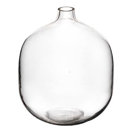 Klasik ve zarif bir tasarıma sahip bu cam vazo, minimalist ev dekorasyonları için ideal bir dekoratif aksesuar niteliğindedir. Tamamen şeffaf cam malzemeden üretilen vazo, yuvarlak ve dolgun bir gövdeye sahiptir. Alt kısmı geniş, üst kısmı dar ve küçük ağızlı olan bu tasarım, modern ve çağdaş bir görünüm sergiler.
