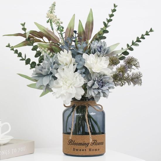 Cam vazoda sunulan bu dekoratif aksesuar, farklı yaprak ve çiçek türlerini bir arada barındırıyor. Beyaz ve gri tonlarındaki çiçekler, yumuşak yeşil yapraklarla desteklenmiş. Özellikle oturma odaları, yemek masaları ve kahve masaları için ideal bir dekoratif ürün.