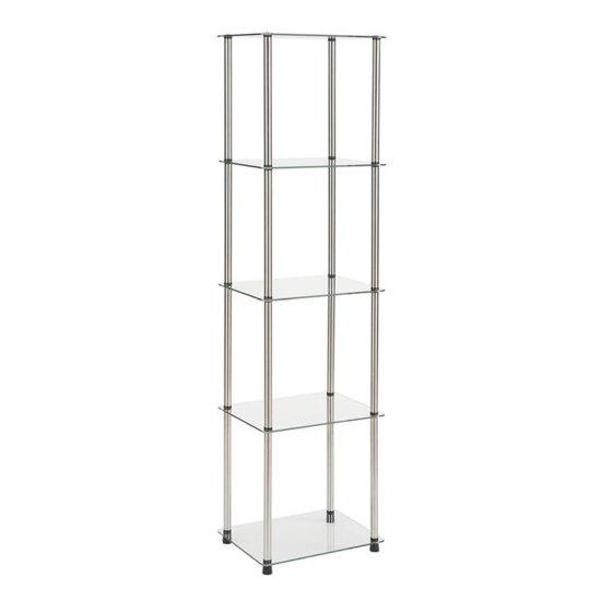 Bu modern cam kitaplık, minimalist ve zarif tasarımıyla her mekana zarafet katan bir depolama çözümüdür. Şeffaf cam ve parlak krom desteklerden oluşan yapısı, 5 ayrı rafıyla geniş bir depolama alanı sağlar.