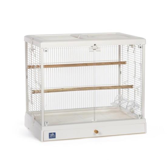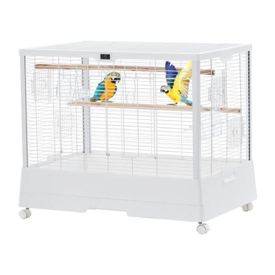 Kafes, dayanıklı beyaz metal çerçeve ve şeffaf cam panellerden oluşuyor. İki ahşap tünekli tasarımı, kuşlarınızın farklı seviyelerde konaklamasına olanak sağlıyor. Alt kısmındaki geniş çekmece, temizlik ve bakım işlemlerini kolaylaştırıyor.