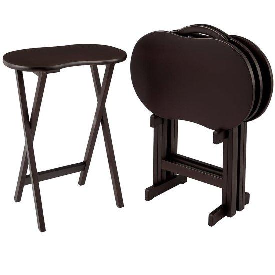 Her bir sehpa, kolay kullanım için katlanabilir mekanizmaya sahiptir. Dikey konumda durabilen bu sehpalar, kullanılmadığı zamanlarda minimal yer kaplar. Koyu kahverengi renk, modern ve şık bir görünüm sergiler.