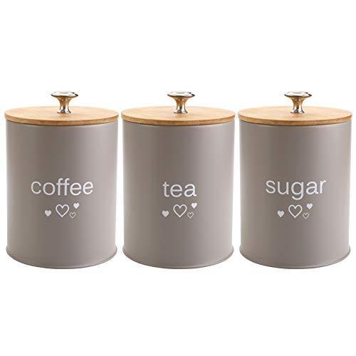 Gri mat metal gövde ve doğal ahşap kapaklarıyla modern ve minimalist bir görünüm sergileyen kavanozlar, mutfak tezgahlarının şık tamamlayıcısı olarak öne çıkıyor. Her kavanozun üzerinde ilgili içeriğin (coffee, tea, sugar) beyaz yazısı ve minik kalp desenli detayları bulunuyor.