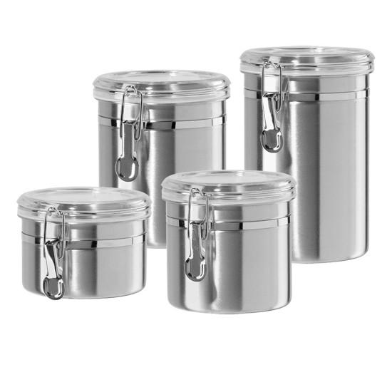 Parlak metalik gümüş rengi ile mutfak tezgahınıza modern bir görünüm katan bu kavanozlar, paslanmaz çelik malzemeden üretilmiştir. Üst kısımlarındaki şeffaf akrilik kapaklı mekanizma, kavanozların sıkıca kapatılmasını ve içindeki ürünlerin uzun süre taze kalmasını garanti eder.