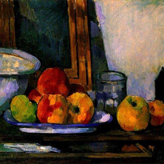 Resimde yeşil renkli bir vazo, beyaz bir örtü üzerinde dizili sarı ve kırmızı elmalar, mavi desenli bir kumaş ve çeşitli nesneler bulunuyor. Empresyonist tarzın karakteristik özellikleri olan yumuşak fırça darbeleri ve renk geçişleri dikkat çekiyor.