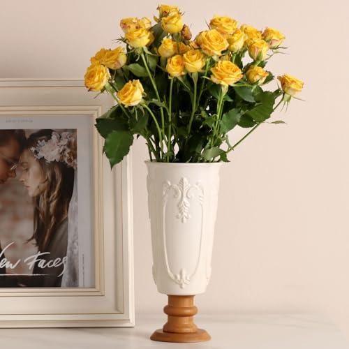 Bu dekoratif ürün, ev içi düzenlemeler için ideal bir aksesuar niteliğinde. Beyaz seramikten üretilen vazo, zarif ve şık bir tasarıma sahip. Vazonun üst kısmında ince kabartma desenler bulunuyor ve altında ahşap bir kaide yer alıyor.