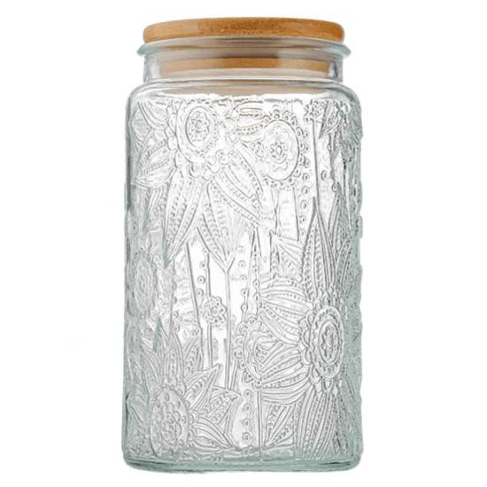 Mutfak ve ev dekorasyonunda şıklığı yakalayan bu cam kavanoz, hem kullanışlı hem de estetik bir aksesuar olarak öne çıkıyor. Şeffaf cam gövdesi üzerinde kabartma çiçek desenleriyle süslenmiş, doğal ve zarif bir görünüm sergiliyor. Ahşap dokulu kapağı, ürüne vintage bir stil katarak modern mutfakların vazgeçilmez parçası haline getiriyor.